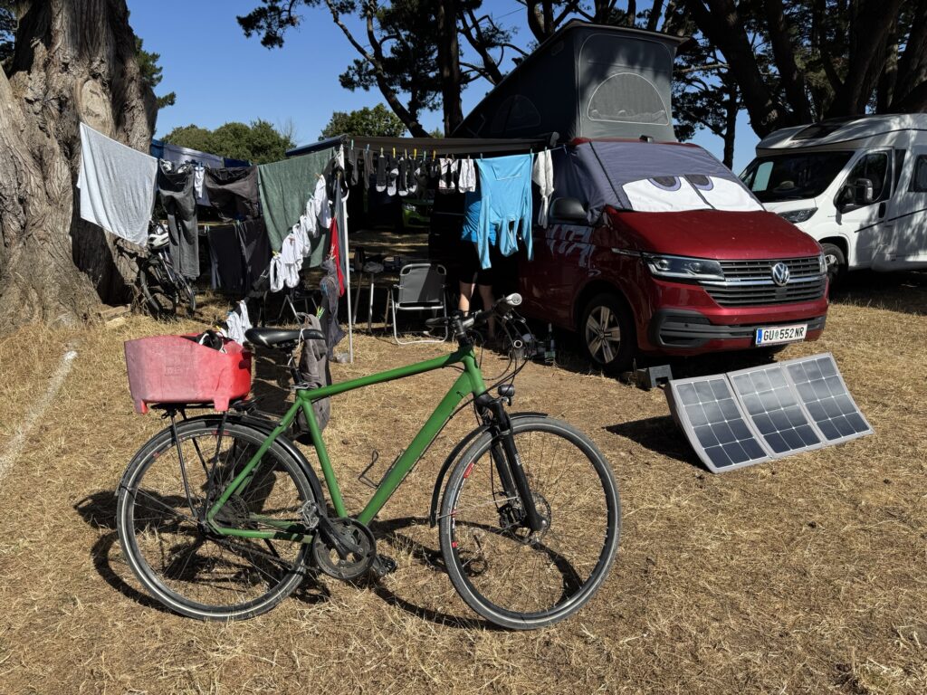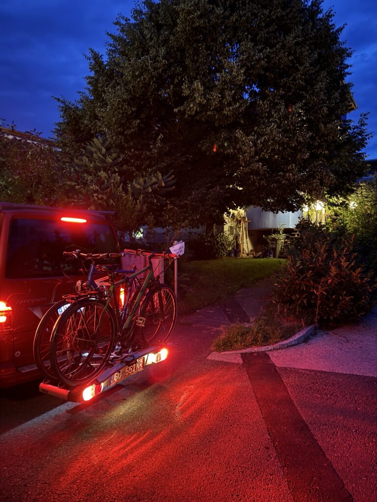 Allein auf dem Parkplatz mitten im Grünen is schon fein. Also Frühstück hergerichtet, Marquise raus, aus der Heckklappe die Sessel geholt Auto ‚aufgesperrt‘, geht nicht, nochmal ‚aufgesperrt‘, Schiebetür zu… und schon waren wir aus dem Auto ausgesperrt, weil ein aufsperren wohl ein zusperren war. Sic. Allein auf dem Parkplatz….