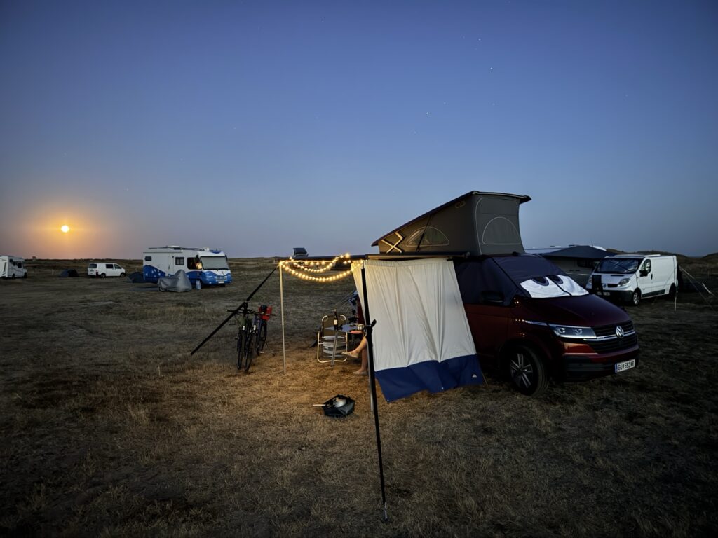 Wach geworden sind wir nur weil die Sonne ordentlich aufs Dachzelt geknallt hat, aber auch das war schon um 1/2 8… Da bahnt sich ein warmer Tag an.